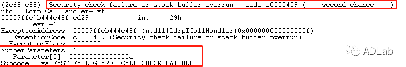 ÔÚÉÏͼÖУ¬³ÌÐòÖÕÖ¹ÓÚint 29h£¬¶øËüµÄ²ÎÊýΪ0xa£¬¶ÔÓ¦FAST_FAIL_GUARD_ICALL_CHECK_FAILURE£¬ÓÉ´ËÍÆ¶ÏÎÊÌâ¿ÉÄÜ·ºÆðÔÚCFGµÄ¼ì²éÀú³ÌÖС£