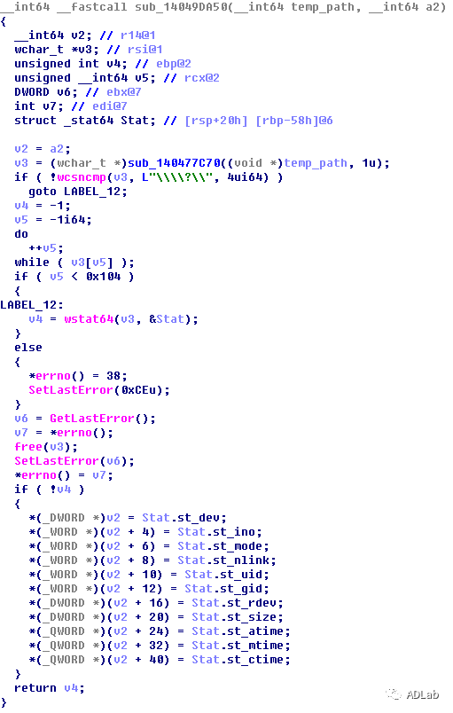 Ê×ÏÈ£¬º¯Êýsub_14049DA50ͨ¹ýsub_140477C70¶Ô×Ö·û´®¾ÙÐÐÁË´¦Öóͷ£¡£È»ºó£¬Å²ÓÃwstat64»ñÈ¡ÏìӦ·¾¶µÄÎļþ״̬£¬ÈôÊÇÀֳɻñÈ¡ÔòÉúÑĵ½Ò»¸ö½á¹¹ÌåÖУ¬²»È»·µ»Ø0xffffffff¡£ÓÉÓÚTempĿ¼Ï²¢Î´·¢Ã÷±¸·ÝÎļþ£¬µ¼Ö»ñȡ״̬ʧ°Ü£¬´Ó¶ø·µ»Ø0xffffffff¡£