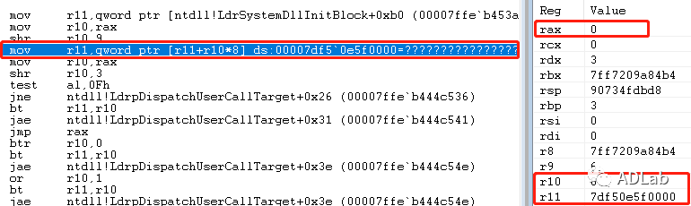ÔÚntdll!LdrpDispatchUserCallTargetº¯ÊýÖУ¬È¡r11+r10*8´¦µÄÖµ¸³Öµ¸ør11ʱ·ºÆðÁËÎÊÌ⣬¸ÃµØµãΪ¿Õ£¬¾ÍÔì³ÉÁË¿ÕÖ¸ÕëÒýÓ㬴ӶøÖ´ÐÐÁËint 29h£¬Ôì³ÉÒì³£¡£È»¶ø£¬×ÝȻûÓÐCFG»úÖÆ£¬³ÌÐòÒ²»áÔÚÖ´ÐС°jmp rax¡±´¦Í߽⣬ͨ¹ýÏÂͼ¿ÉÒÔ¿´³ö£¬CFG»úÖÆ½ö½öÊÇÔÚÔ±¾³ÌÐòÌø×ªÖ¸ÁîǰÌí¼ÓÁËһЩ¼ì²é¡£